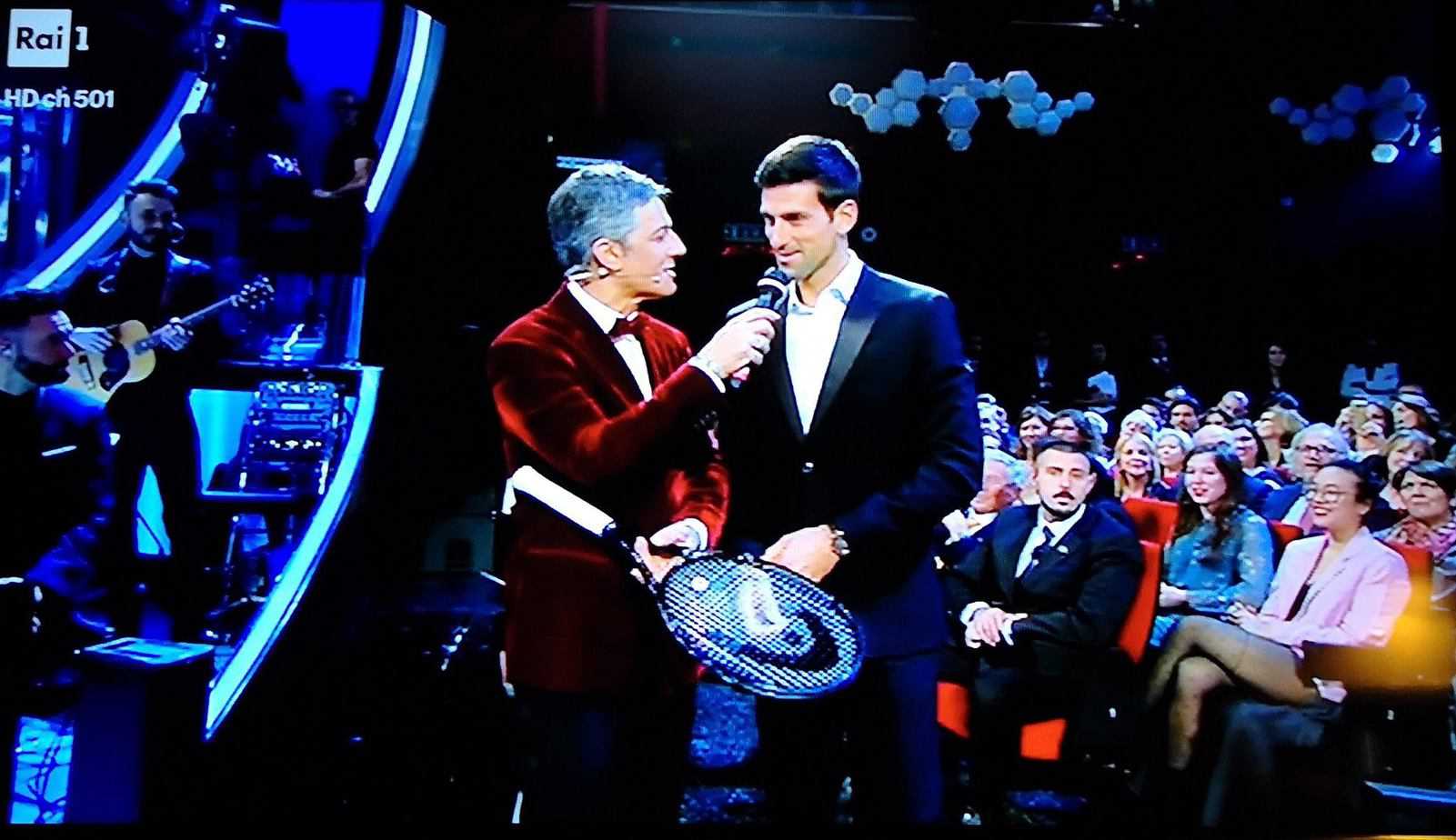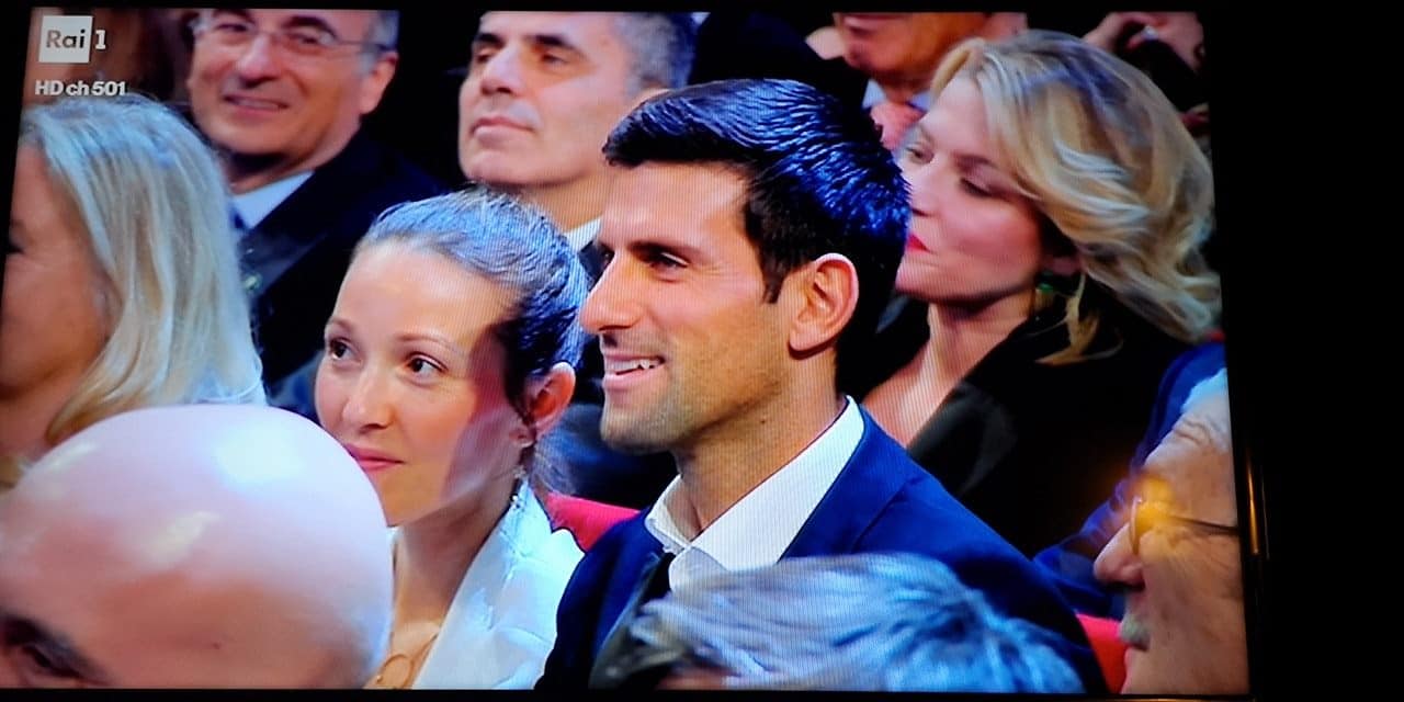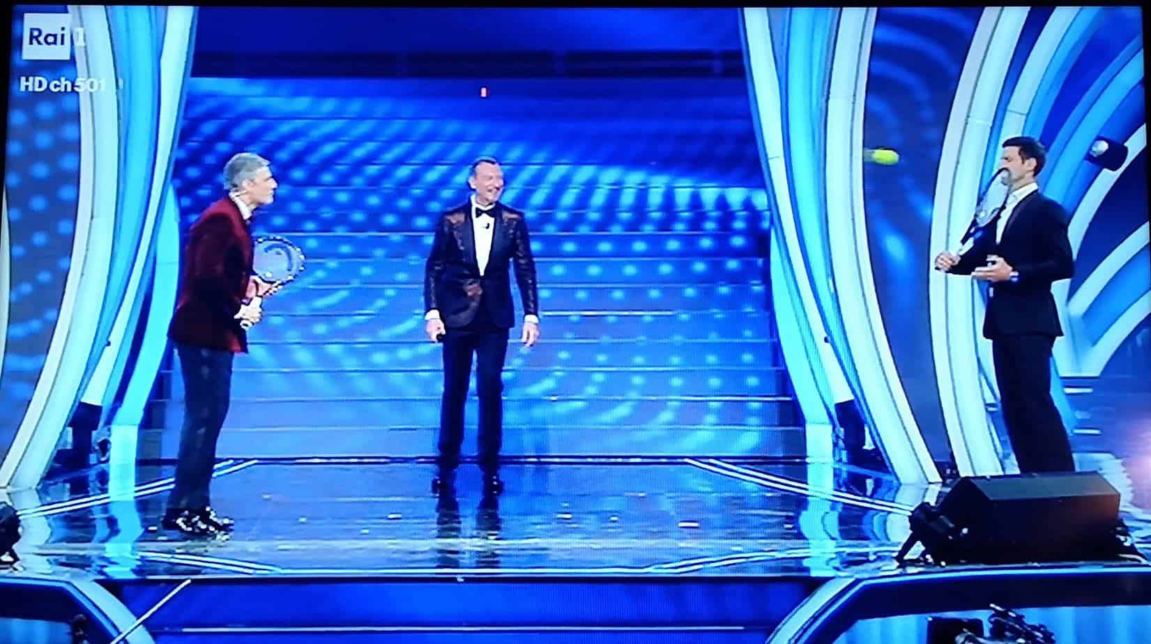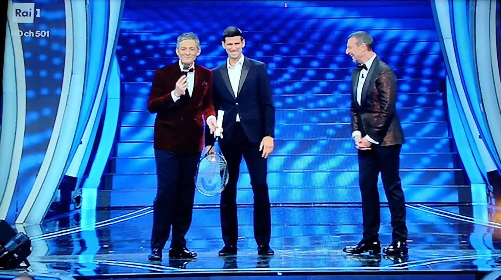 E’ stato proprio lo showman siciliano, grande amico di Nole, ad organizzare il tutto. E il numero uno del mondo è arrivato in Liguria da Montecarlo – dove risiede con la famiglia – insieme alla moglie Jelena. Sul palco dell’Ariston il serbo, come sempre perfettamente a suo agio, ha dapprima intonato “Terra promessa” insieme ai conduttori e poi fatto due scambi al volo con Fiorello.