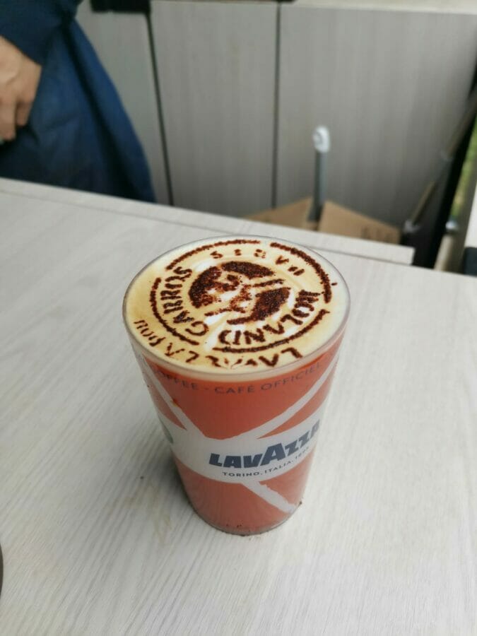 Prima di vedere Rublev esibirsi al campo 14, però, una curiosità: prendiamo un caffè in uno stand Lavazza e scopriamo che il logo del Roland Garros viene messo addirittura sui cappuccini (del cacao viene fatto passare attraverso uno stampino con la forma del logo, vedi foto).